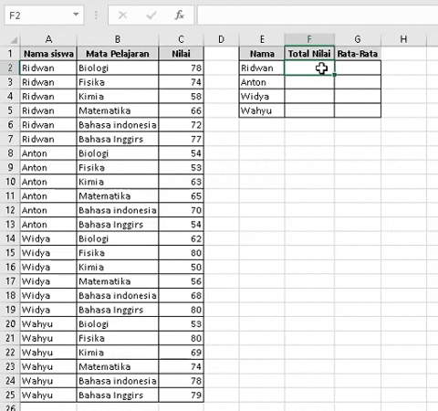 - =SUMIF($A$2:$A$25,E2, Cell "E2" berfungsi ini adalah kreteria yang digunakan untuk mencari atau mencocokan pada range tabel A2 sampai A25, E2 ini berarti cari nama Ridwan(Nilai E2) di tabel A2 sampai A25.